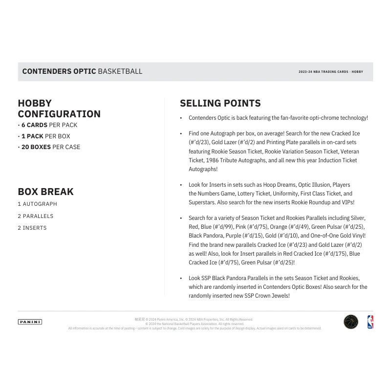 The 2023/24 Panini Contenders Optic Basketball Hobby Box delivers a premium collecting experience, combining the iconic Contenders design with a modern Opti-Chrome finish. Each box contains 6 cards, including 1 autograph, 2 inserts or parallels, and 3 base season ticket cards. Collectors can chase the highly coveted Rookie Ticket Autographs featuring the NBA’s top 2023 rookies, along with stunning parallels such as Gold Vinyl 1/1 and Cracked Ice. Look for new insert sets like Lottery Ticket and Uniformity, plus returning favorites like Superstars Die-Cuts and Optic Hall of Fame Contenders. With its sleek designs and rare autograph opportunities, Contenders Optic is a must-have for basketball collectors seeking both rookies and established stars.