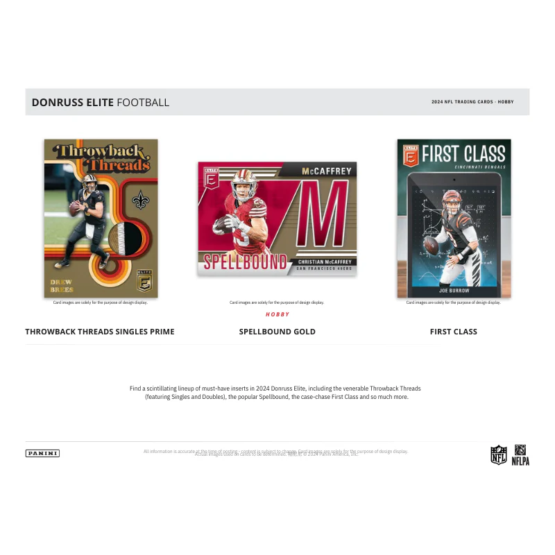 • Find a scintillating lineup of must-have inserts in 2024 Donruss Elite, including the venerable Throwback Threads (featuring Singles and Doubles), the popular Spellbound, the case-chase First Class and so much more.