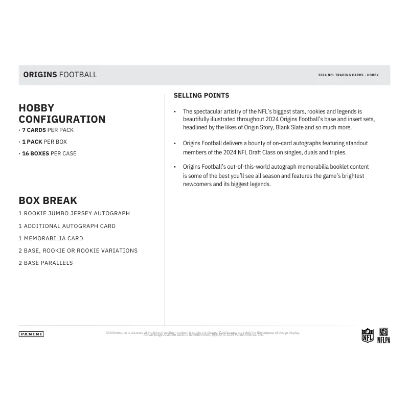 - The spectacular artistry of the NFL’s biggest stars, rookies and legends is beautifully illustrated throughout 2024 Origins Football’s base and insert sets, headlined by the likes of Origin Story, Blank Slate and so much more.