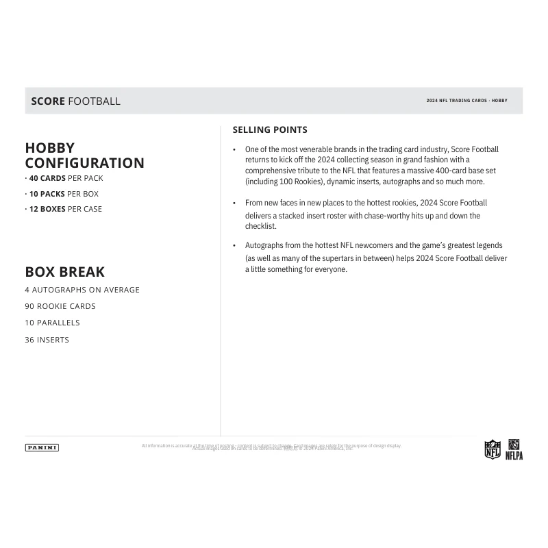 • One of the most venerable brands in the trading card industry, Score Football returns to kick off the 2024 collecting season in grand fashion with a comprehensive tribute to the NFL that features a massive 400-card base set (including 100 Rookies), dynamic inserts, autographs and so much more.